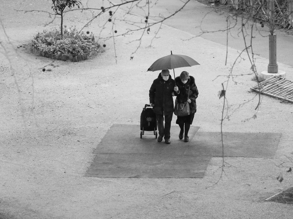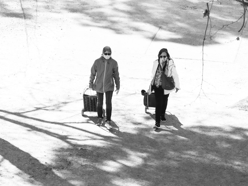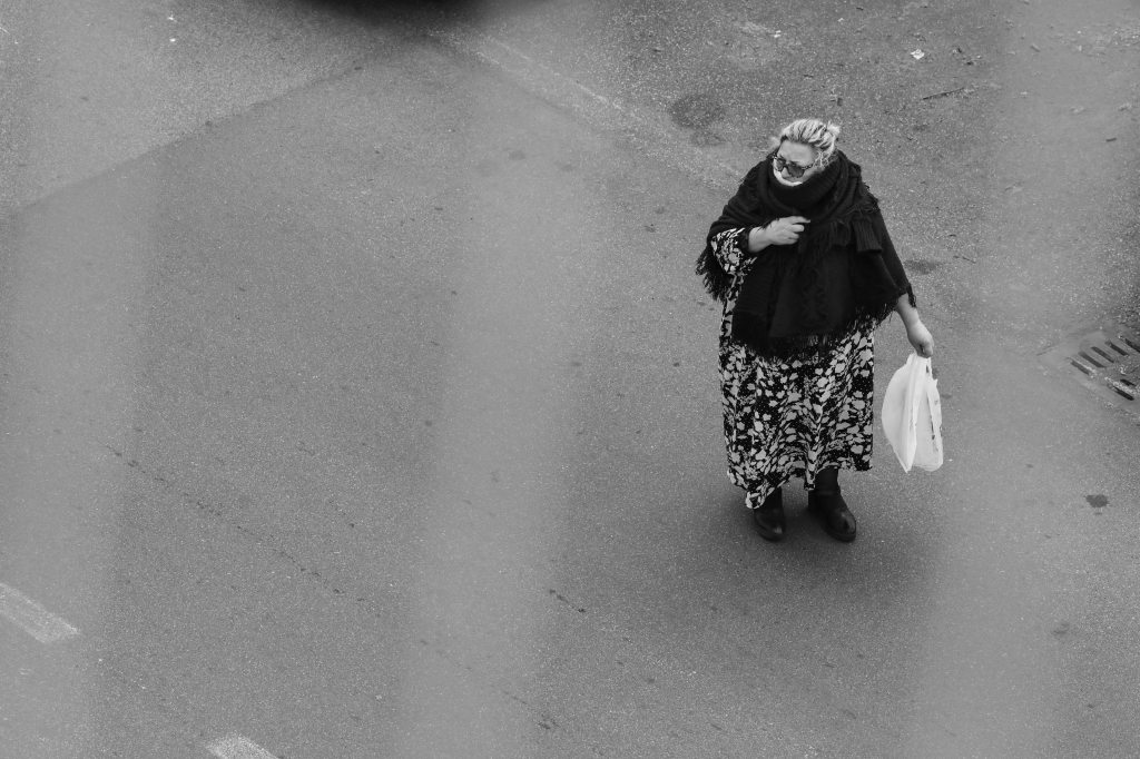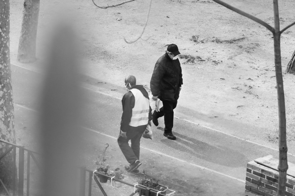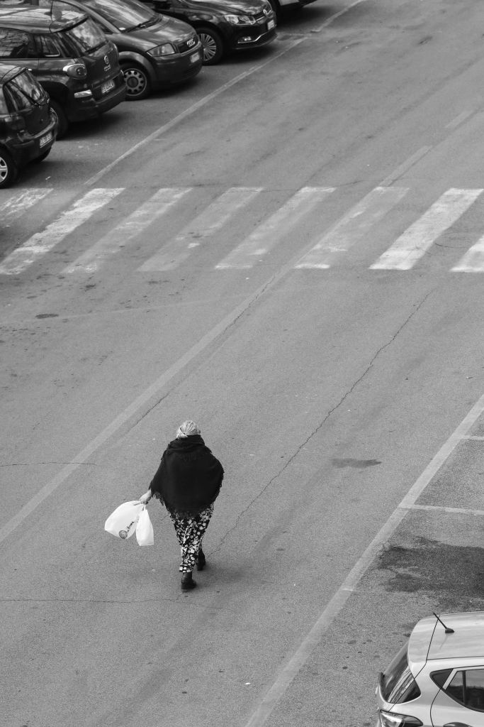 Oggi fotografo dal balcone i passanti della quarantena. Quando passo le foto al computer e ingrandisco i fotogrammi osservo i loro volti e leggo paura, ansia, angoscia, fatica, speranza, ogni tanto un sorriso regalato dall’amico al guinzaglio. Il mio balcone è diventato il mio studio, la mia torre di guardia delle emozioni che passeggiano nel mio raggio di vista. Sto lì ed aspetto di catturare qualcosa. Il tempo passa veloce e lento allo stesso tempo.