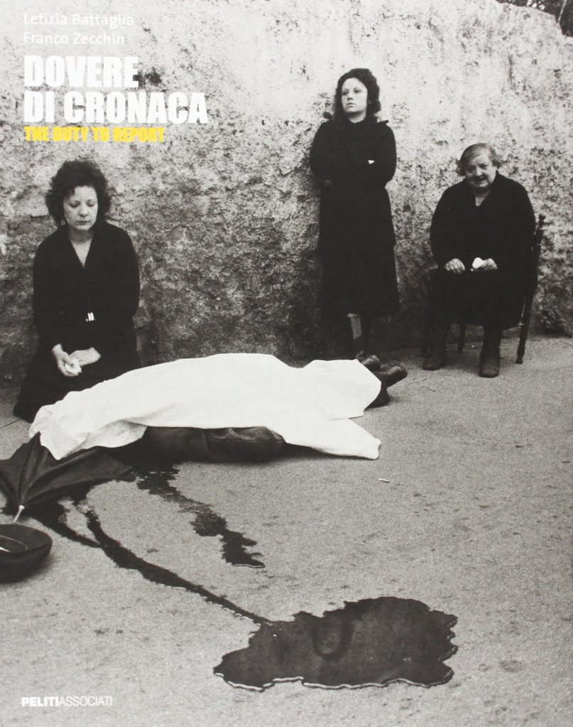 La prima volta che incontrai Letizia Battaglia fu in sogno, nel 2011. Eravamo soli, seduti in un salotto borghese e parlavamo di fotografia sfogliando alcune sue stampe. In quella circostanza io non riuscivo a parlare o ad emettere alcun suono: sentivo solo la sua voce e i suoi racconti, come in un documentario e come se la conoscessi da sempre, c’era anche il montaggio! La sognai dopo aver letto il catalogo della mostra di “Dovere di cronaca – the duty of report” a cura di Franco Zecchin, compagno di vita e di lavoro per diciott’anni della grande autrice palermitana. È un lavoro importante, questo, tra i suoi più celebri, poiché rappresenta l’incontro e il mescolarsi – come in una tavolozza di colori a olio – di tutto ciò che era più caro alla grande Letizia: Palermo, l’impegno sociale, gli ultimi, la bellezza, lo sguardo delle donne. O per dirla meglio: la restituzione dello sguardo delle donne. Per capirlo basta vedere proprio la copertina del catalogo: tre donne ai piedi di un corpo morto, ucciso, coperto da un telo, vittima di quella guerra di mafia oggetto del testo.