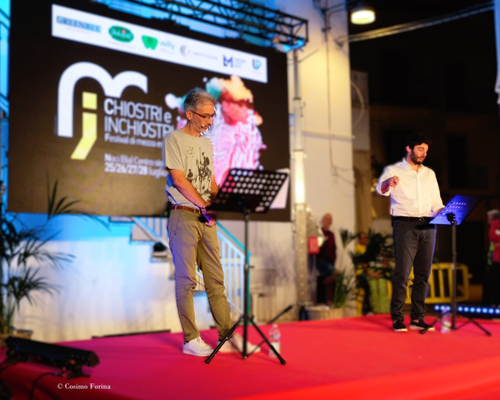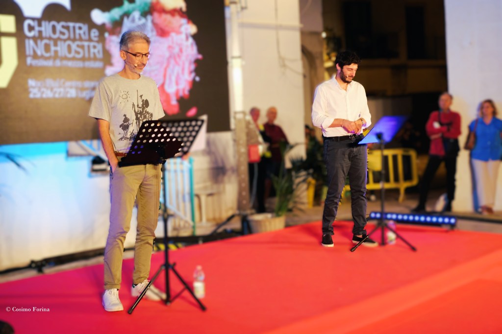 A Noci per Chiostri e Inchiostri, il Festival di mezza estate diretto da Piero Liuzzi giunto quest’anno alla quinta edizione, Lino Guanciale ha donato alla comunità una meravigliosa testimonianza di come l’amore tra due persone (un fatto privato) possa creare incanto e diffondere cultura per tutte e tutti (in una dimensione pubblica): l’attore ha infatti raccontato che è stata sua moglie, Antonella Liuzzi, a fargli conoscere Ferrovie del Messico (Laurana Editore 2022), il romanzo di Gian Marco Griffi candidato alla LXXVII Edizione del Premio Strega. E Lino Guanciale ha deciso di presentarlo alle 23.30 in forma di reading con l’autore a Largo Rotolo che trabocca di sguardi e di volti, di varie generazioni, curiosi e attentissimi.