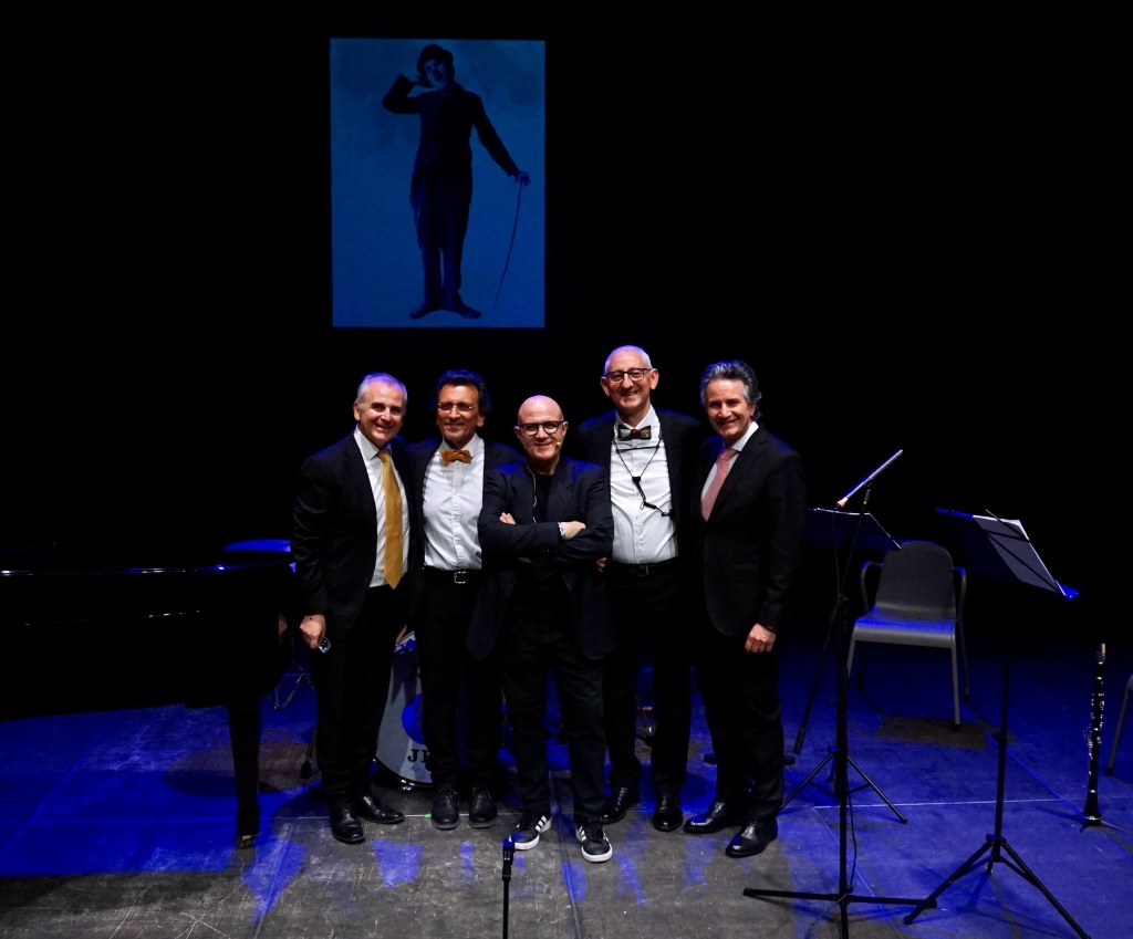 Il concerto “Un poeta del silenzio e della melodia. Charlie Chaplin e le sue colonne sonore”, andato in scena il 22 aprile 2026 al Nuovo Teatro Abeliano di Bari per la trentunesima stagione del Collegium Musicum, nasce precisamente da questa intuizione del M° Rino Marrone: restituire Chaplin non soltanto come icona del cinema, ma come autore totale, capace di pensare immagine, tempo e suono come parti inseparabili di una stessa forma. Sul palco, accanto all’introduzione impeccabile e alle elaborazioni video di Livio Costarella, i Solisti del Collegium Musicum (Antonio Piccialli al pianoforte, Giambattista Ciliberti al clarinetto, Paolo Debenedetto al sassofono e Stefano Baldoni alle percussioni) hanno costruito un percorso che, più che illustrare dei film, ne ha riattivato la memoria sensibile.
